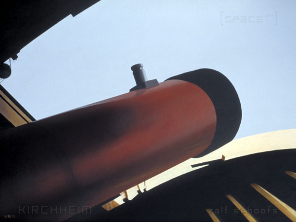Sternwarte Kirchheim ← Vorheriges Nächstes → Sternwarte Kirchheim. Acryl auf Spanplatte, 60 cm mal 90 cm. Das Newton-Teleskop der Sternwarte Kirchheim. Acryl auf Spanplatte, 1996.